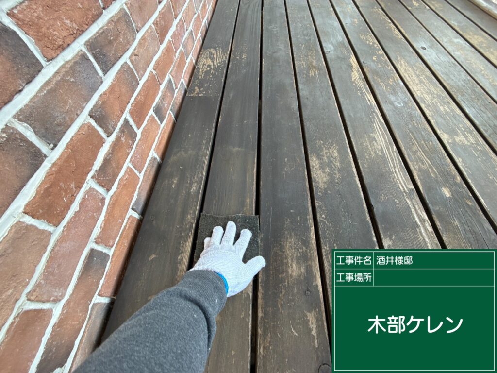 ウッドデッキ塗装では、洗浄、研磨(ケレン作業)などの下地処理がとても重要です。古い汚れや傷んだ部分を整えることで、塗料の浸透性が高まります。