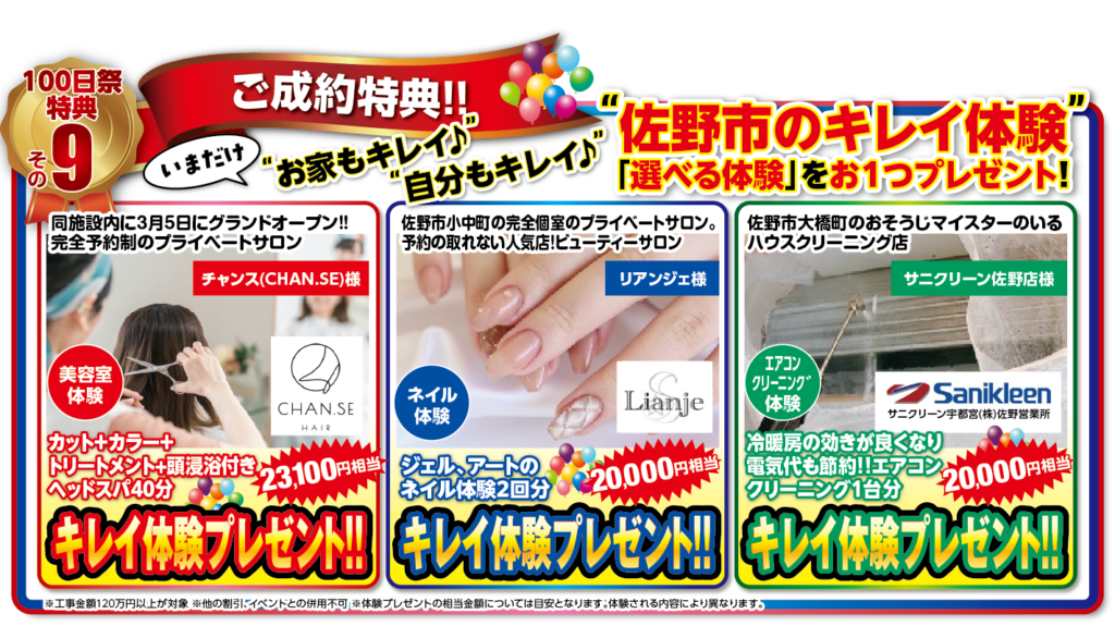 そして、最後に、キレイ家でキレイに!お家もキレイ!自分もキレイ!と佐野市地域密着として、ご成約特典がお選びいただけます!普段なかなか行けない利用する機会が少ない「自分磨き」をぜひご体験ください!!